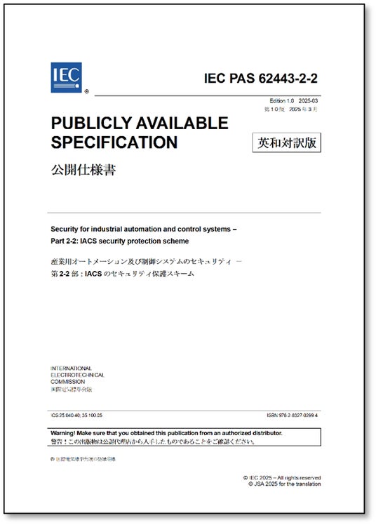 一般財団法人日本規格協会(本部:東京都港区、理事長:朝日弘)は、2025年9月1日(月)に「IEC/PAS 62443-2-2 Ed. 1.0:2025 (en)産業用オートメーション及び制御システムのセキュリティ-第2-2部:IACS のセキュリティ保護スキーム」の邦訳(英・日対訳版)を発行いたしました。