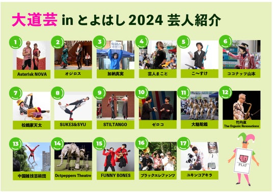 パントマイムコメディやアクロバット、コメディ、ジャズ、中国雑技などの17組が出演を予定。「いつもの街がまるごと劇場になる2日間!」で、笑いと涙、驚きにあふれます。