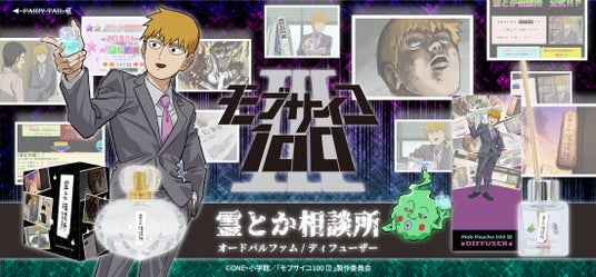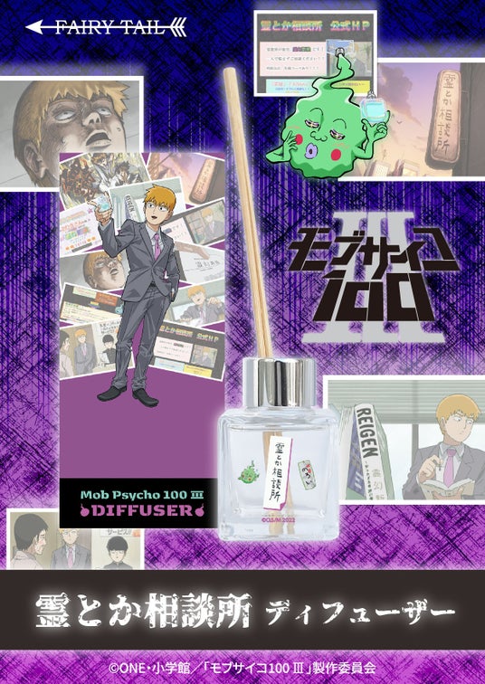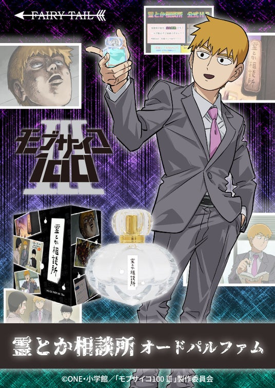フェアリーテイル株式会社(東京都港区、代表取締役 熊谷勇希)は、 TVアニメ『モブサイコ100 III』より霊幻新隆が営む「霊とか相談所」の香水、ディフューザー、Tシャツを発売します。同時に香水を持った5人のキャラクターの新規描き下ろしイラストを使用したアクリルスタンド、クリアファイルも発売します。