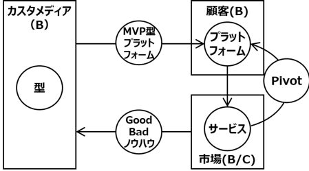 多くの実績から蓄積したノウハウをもとにプラットフォーム開発の「型」を保持。「型」をベースにMVP(最小機能構成)プラットフォームをお客様に提供。お客様はそこでサービスを組み立て何度も市場・顧客検証を行い、Pivotを繰り返し、高精度の開発を実施。こうした開発行為で得られたGoodノウハウ、Badノウハウをフィードバックすることで、「型」のさらなる精度向上を図ります。