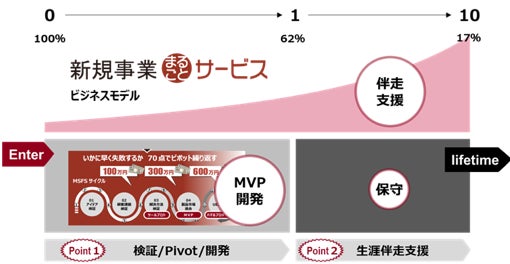 「多産多死」といわれる新規事業の成功率を上げるため、事業の成長フェーズに合わせてシステム開発から伴走支援までを一貫して提供するサービスです。