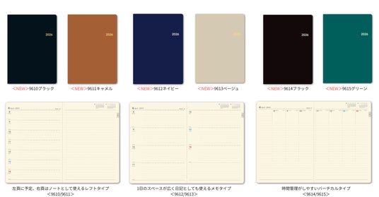 ・定番人気のレフトタイプ、日記代わりにも使えるメモタイプ、時間管理がしやすいバーチカルタイプの選べる3種のレイアウト