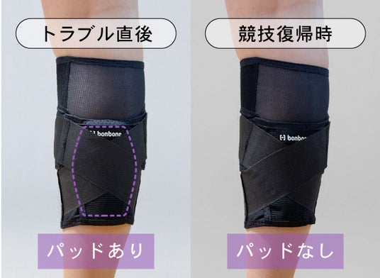 トラブル発生から競技復帰までの長い期間使っていただけるよう、パッドを出し入れ可能にし、圧迫力を調整できるようにしました。基本はパッドを入れたままご使用いただき、競技復帰につれて「パフォーマンスに影響が出る」「圧迫力を弱くしたい」といった場合に、パッドを抜いてご使用いただけます。