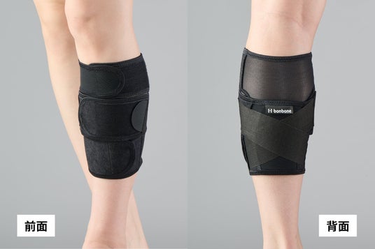 本体ベルトを左右互い違いに止めていく新しい構造を採用しました。これにより、ふくらはぎの形状にしっかりと追従し、ふくらはぎの「ねじれ」を防ぎます。従来品よりもフィット感が高まり、激しい動きの中でもしっかり固定します。