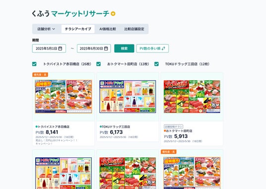 「くふうマーケットリサーチ」では最大で過去3年分のチラシデータを閲覧できます。商圏エリアのチラシ収集の手間を削減し、PCやタブレットなどからいつでもどこでも過去の販促事例(チラシのテーマや掲載商品、価格など)を検索・閲覧することができます。