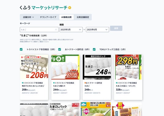 AIによる高度な画像解析技術を用いて、過去にチラシ掲載されていた商品の価格比較ができます。商圏エリアの店舗がどのタイミングでいくらに設定していたかの売価チェックが行えるため、データに基づいた戦略的な価格設定が可能になります。