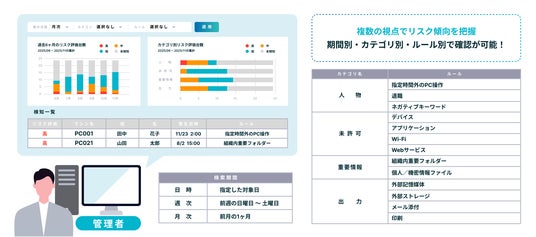 「リスク検知」は、PC操作ログを活用し、情報漏洩や内部不正の兆候をスコアリングしてダッシュボードで可視化します。専門知識がなくても簡単に導入でき、既存のログ資産を活用することで、コストを抑えながらリスクの未然防止を支援します。