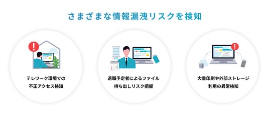 テレワーク環境における不正アクセスの兆候や、退職予定者による重要情報ファイルの持ち出し、一定期間内の大量印刷や外部ストレージの利用など、情報漏洩リスクの高い操作を検知します。