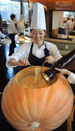 また2階オールデイダイニング「カフェ トスカ」では、ランチブッフェの人気メニューが「かぼちゃナーラ」に変身!10月24日(土)~31日(土)のランチタイム限定のアクションメニューとして、かぼちゃのクリームソースとあえるカルボナーラは、パルミジャーノレッジャーノをたっぷりと絡めたゆでたてのパスタに、濃厚なかぼちゃのクリームソースがベストマッチ。かぼちゃの甘みがあとを引く美味しさです。お客様よりご注文をお伺いしてから、ひとつひとつお作りいたしますので、出来立てをお召し上がりいただけます。