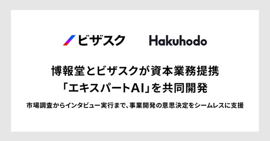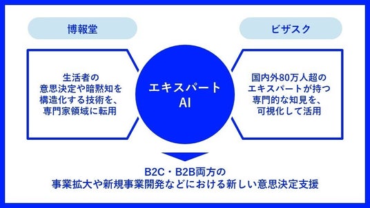 このたびの資本業務提携では、新規事業開発や市場参入・マーケティング戦略立案に取り組む企業の担当者に向けて、ビザスクのエキスパートが持つ業界特有の常識や視点と、博報堂が培ってきた意思決定の思考構造化のノウハウおよびAIエンジンを組み合わせたAIサービス「エキスパートAI」を共同開発します。