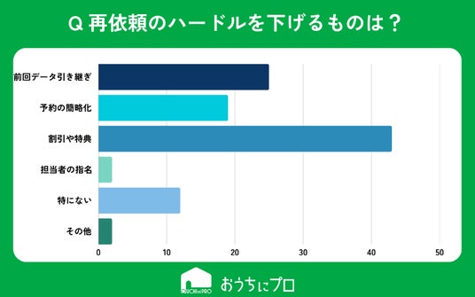 - 再依頼のハードルを下げる要素は「割引や特典」「前回のデータの引き継ぎ」。