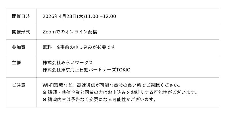 即戦力となるプロフェッショナル人材のマッチングサービス『フリーコンサルタント.jp』を展開する株式会社みらいワークス(本社:東京都港区、代表取締役社長 岡本 祥治、以下「当社」)は、2026年4月23日(木)株式会社東京海上日動パートナーズTOKIOと共催でオンラインセミナーを開催します。