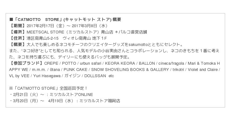 同時開催企画として、ミツカルストア青山店においても、本企画に合わせ、「大人でも楽しめるネコモチーフのクリエイターグッズ」をテーマに商品をセレクトした企画「CATMOTTO STORE」を開催いたします。