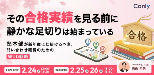 Google ビジネスプロフィール、Yahoo!プレイス、Appleマップなどの3大地図媒体、HP、アプリ、SNSなどの店舗集客媒体の一元管理サービス「カンリー店舗集客」の開発・提供を行う株式会社カンリー(所在地:東京都品川区、代表取締役:辰巳 衛,秋山 祐太朗)は2026年2月24日(火)・25日(水)・26日(木)の3日程で学習塾業界向けセミナー【その「合格実績」を見る前に、静かな足切りは始まっている! ~塾本部が新年度に仕掛けるべき、問い合わせ獲得のためのWeb戦略~】をオンライン開催いたします。