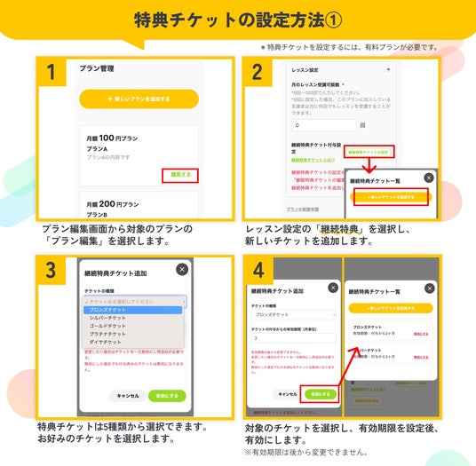 ⇒ファンクラブのプラン継続に応じて支援者に継続特典として特別なチケットを付与し、レッスン作成時にその特別チケットを使用した予約枠を作成できる機能です。