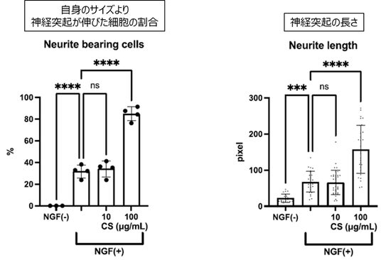 ラット副腎褐色細胞腫由来PC12細胞に神経成長因子(NGF)と冬虫夏草のエタノール抽出物(0、10、100mg/mL)を作用させ、神経突起伸長を誘導した。分化誘導5日目の分化した細胞数の割合(左グラフ)と神経突起の長さ(右グラフ)を定量化した。冬虫夏草(CS)抽出物100 μg/mL投与群では分化細胞数と神経突起長が有意に(p < 0.0001)増加しており、冬虫夏草による神経分化促進作用が示された。(三重大学実施)