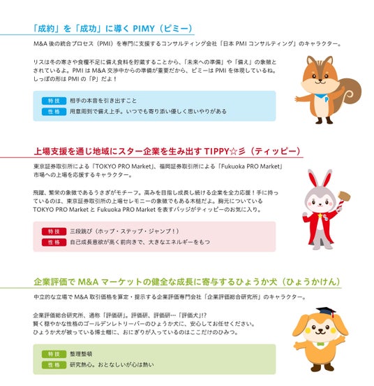 このたび、当社が重視するPMI(M&A成立後の経営統合)や上場支援、企業評価を象徴するコーポレートキャラクターをそれぞれ新たに制作することで、当社グループが大切にする価値観である、M&Aの”成功“へのこだわりや、経営者への総合的かつワンストップな支援を体現しています。