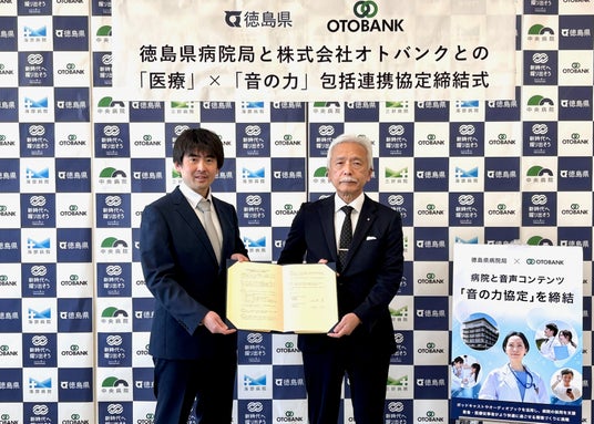 オーディオブックの制作・配信サービスの運営およびポッドキャスト事業を手掛ける株式会社オトバンク(本社:東京都文京区、代表取締役社長:久保田裕也、以下「オトバンク」)は、2025年3月18日(火)に、徳島県病院局と「音の力」を活用して地域医療の充実・強化を図る包括連携協定を締結しました。今後、ポッドキャストを活用した医師の採用支援や、病院でのオーディオブック導入などを広げてまいります。オトバンクと医療施設の包括連携協定は、今回が初めてです。