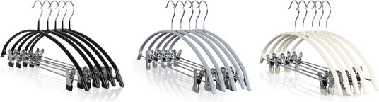 従来のアーチ型ハンガーにクリップを備えた新タイプを追加いたしました。トップスだけでなくボトムスも1本で掛けられるようになり、ハンガーの掛け替えや種類を使い分ける手間を減らします。