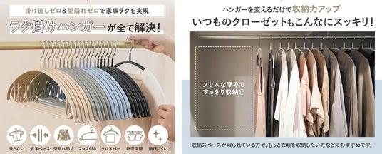 衣類がズレ落ちにくく、クローゼット内を美しく保てる点が支持され、直近1年間で累計販売数100万本を突破。日常使いのハンガーとして、多くのお客様にご利用いただいています。