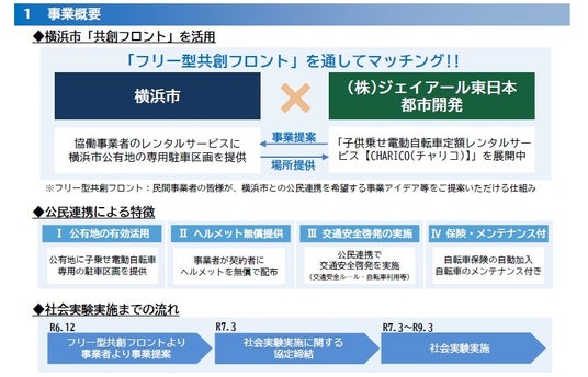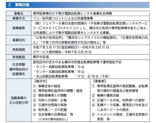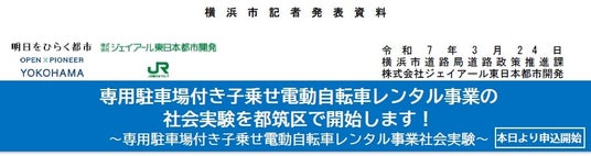 横浜市と株式会社ジェイアール東日本都市開発は、公有地の有効活用、横浜市シェアサイクルの機能補完及び子育て世代の移動利便性の向上等を目的として、「専用駐車場付き子乗せ電動自転車レンタル事業社会実験」の実施に関する協定を締結し、社会実験を都筑区で開始します。