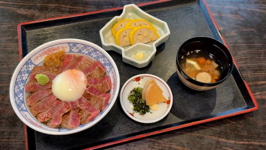 終点の宮地に着くと、そこから先は車での移動。熊本名物あか牛を丼に贅沢に盛ったあか牛丼を楽しむ。丼のふたを開けた瞬間、友近、礼二が「うわ~!」と声をそろえる。レア気味に焼かれた肉が同心円状に美しく並び、その中央には温泉卵が。諦めの境地に達した礼二は、「柔らかいんだろうねえ…」と寂しそうにつぶやき…。