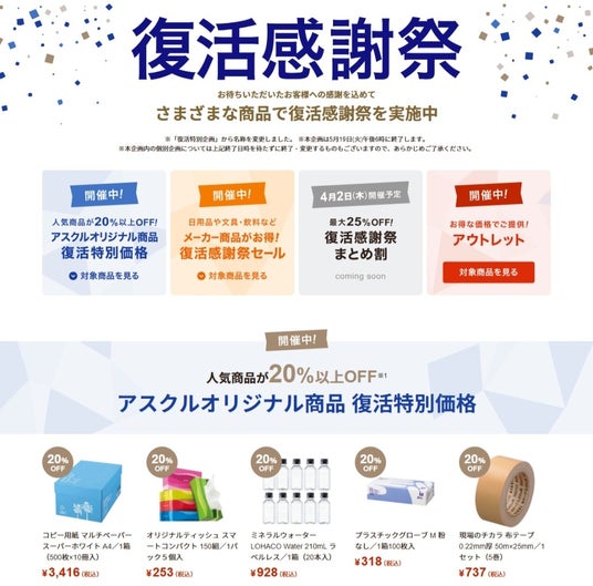 アスクル株式会社(本社:東京都江東区、代表取締役社長:吉岡 晃、以下「アスクル」)は、事業所向け(BtoB)通販サービス「ASKUL」「ソロエルアリーナ」において実施中の「復活特別企画」(※1)を拡大し、本日2月24日18時より「復活感謝祭」として開催します。期間中、メーカー100社超の商品約400点を大幅値下げするほか、3月2日18時からはオリジナル商品の復活特別価格対象を拡大し、約800点を20%以上オフで販売します。(※2)