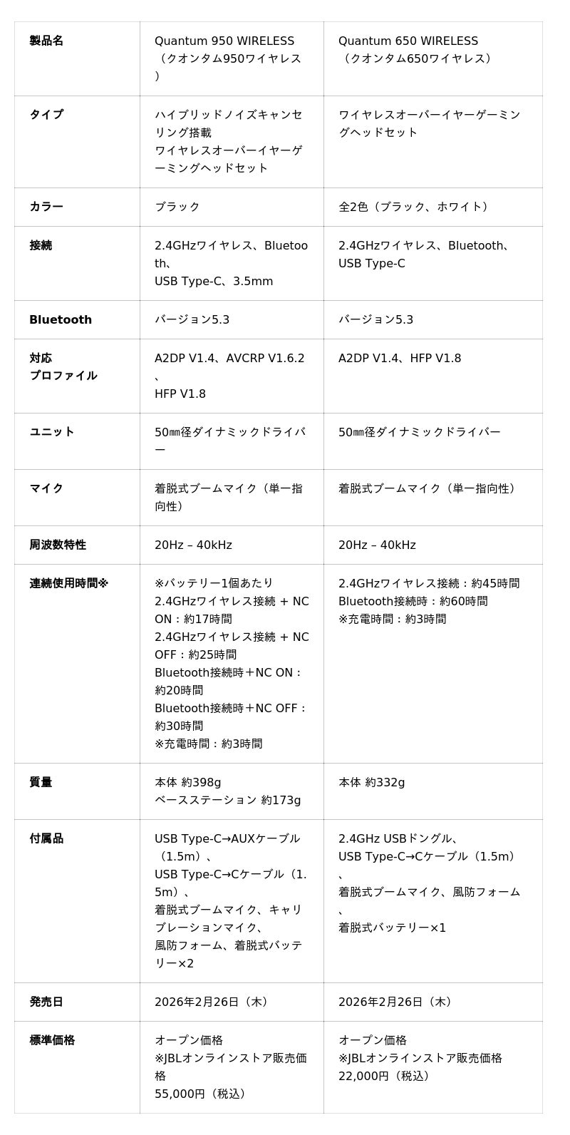ハーマンインターナショナル株式会社(本社:東京都千代田区、代表取締役:桑原拓磨)は、アメリカ カリフォルニア発祥の世界最大級のオーディオブランド「JBL」が手掛けるゲーミング用デバイス「JBL Quantum(クオンタム)」シリーズの新モデルとして、「JBL Quantum 950 WIRELESS」「JBL Quantum 650 WIRELESS」「JBL Quantum 250」を2026年2月26日(木)に発売いたします。