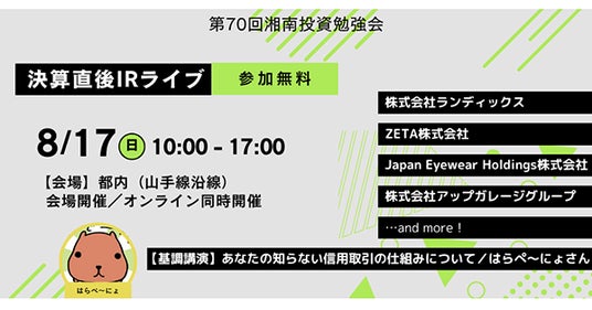 2025年8月17日(日)に東京で開催される個人投資家向けIRセミナー「湘南投資勉強会」の『新企画IRライブ』に代表取締役社長の山崎が登壇いたします。