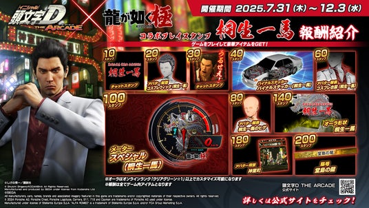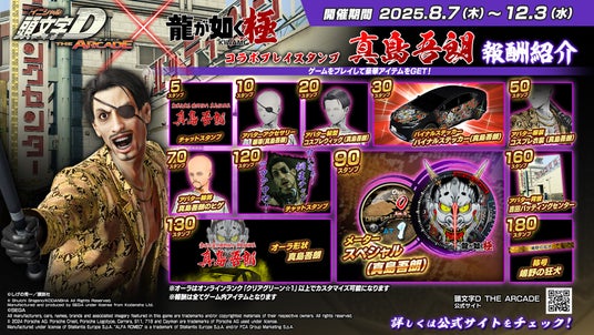 株式会社セガ フェイブ(本社:東京都品川区、代表取締役社長執行役員:杉野行雄、以下 セガ フェイブ)は、アミューズメント施設向けタイトル『頭文字D THE ARCADE(以下、頭文字DAC)』におきまして、2025年7月31日(木)より、『龍が如く 極』コラボレーションイベントを開催いたします。