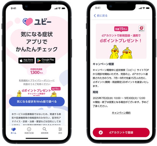 株式会社NTTドコモ(以下、ドコモ)は、Ubie株式会社が提供する症状検索エンジン「ユビー」(以下、ユビー)にて「dアカウント(R)」をはじめて連携し、症状に関する質問を完答したお客さま先着15万名を対象に、dポイント(期間・用途限定)20ポイントを進呈する「ユビーとのdアカウント連携でdポイント20ポイントプレゼントキャンペーン」(※1)(以下、本キャンペーン)を、2025年7月2日(水)から2025年9月30日(火)までの期間で開催いたします。