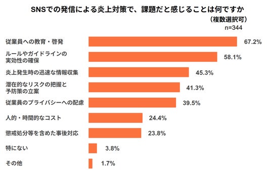 SNSでの発信による炎上対策での課題については、「従業員への教育・啓発」が67.2%を占め、上位となりました。続いて「ルールやガイドラインの実効性の確保」が58.1%、「炎上発生時の迅速な情報収集」が45.3%と続きました。