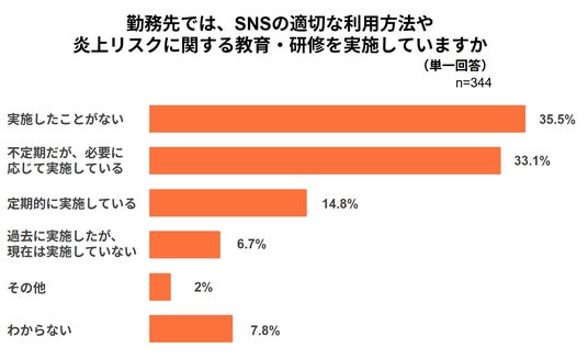 勤務先でSNSの適切な利用方法や炎上リスクに関する教育・研修を実施しているかどうかについては、「実施したことがない」が35.5%でもっとも多い回答になりました。一方、「不定期だが、必要に応じて実施している」が33.1%、「定期的に実施している」が14.8%となり、半数に近い企業が教育・研修を実施しているという結果となりました。