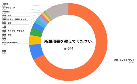 アンケート回答者の所属部署については、「法務・コンプライアンス」が67.4%でもっとも多く、「総務」が6.4%、「経営企画・DX推進」が4.1%、「管理」が3.2%と続きました。