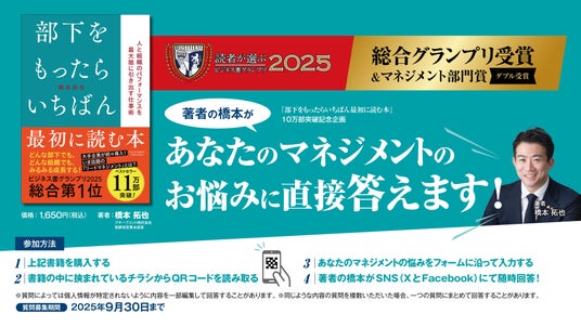 『部下をもったらいちばん最初に読む本』(著者:橋本拓也)が、11万部を突破しました。読者の皆様への感謝を込めて、著者の橋本拓也がマネジメントに関するお悩みにSNSで直接お答えする10万部突破記念企画を実施いたします。