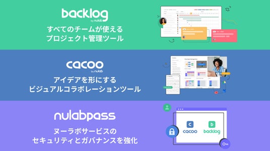 ヌーラボは、プロジェクト管理ツール「Backlog」、ビジュアルコラボレーションツール「Cacoo」、組織の情報セキュリティ・ガバナンスを高めるための「Nulab Pass」を開発・提供しています。