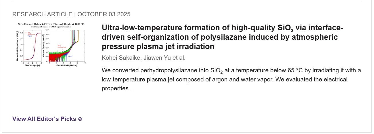 本論文は、2024年に AIP Advances に掲載され、「AIP Publishing Showcase」に選出された上記の内容を含む論文 “Silica conversion of polysilazanes by low-temperature plasma jet generated from Ar and water-vapor mixed gas” で得られた成果を基に、その根本原理に焦点を当てたものです。すなわち、なぜ1000℃で形成した熱酸化膜品質(J -E 特性、C -V 特性、界面準位密度、固定電荷密度)に匹敵する SiO2薄膜を、65℃未満の超低温で実現できるのかという問いに対し、界面駆動型自己組織化(interface-driven self-organization:IDSO)モデルを提唱、その根本原理を明らかにしました。