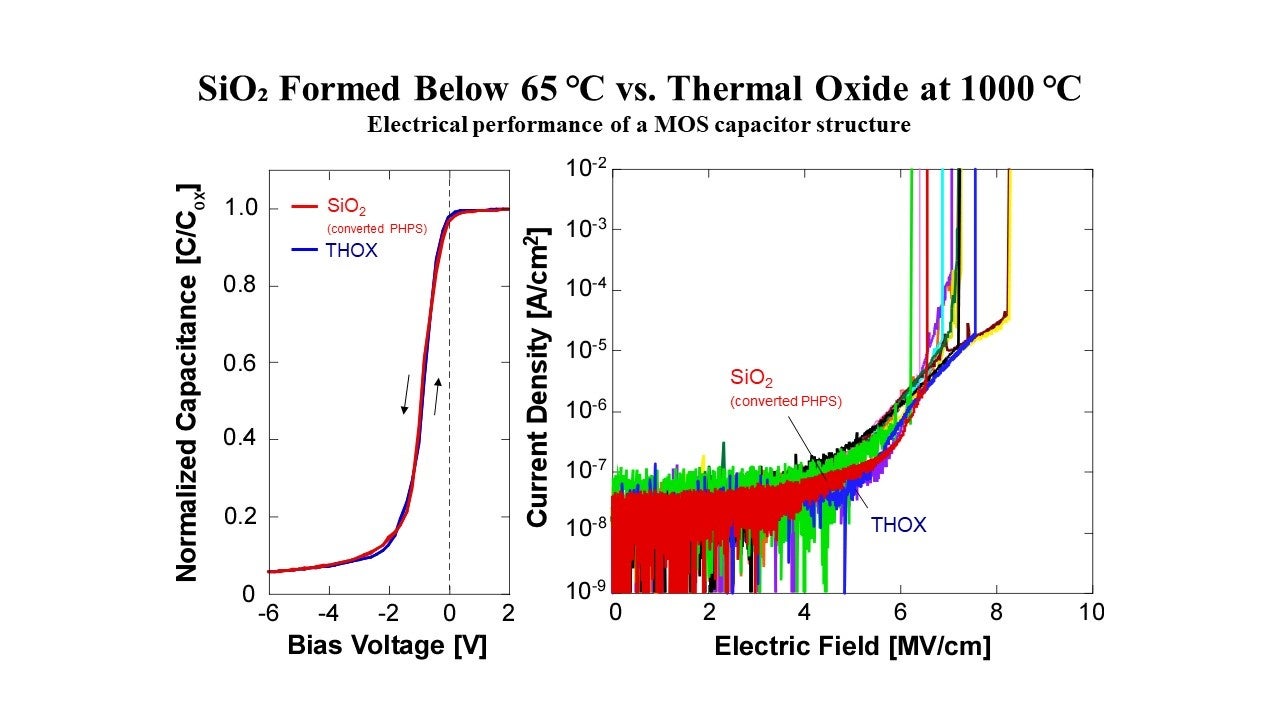 研究チームは、これまでに大気圧プラズマを応用した独自のアプローチによりパーヒドロポリシラザン(perhydropolysilazane : PHPS)を、わずか65℃未満という超低温で約1000℃で形成した熱酸化二酸化珪素(SiO2)薄膜と同等の電気特性(J -E 特性、C -V 特性、界面準位密度、固定電荷密度)を示す高品質SiO2薄膜へシリカ転化させることに成功しています。