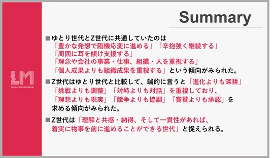 ・ゆとり世代、Z世代ともに推進力ならびに機動力や発想力、忍耐力や持続力、傾聴力や支援力が高く、理念戦略・事業内容・仕事内容・人的魅力・組織風土を重視し、ゼネラリスト指向が高い傾向であった。