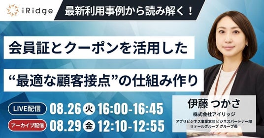 株式会社アイリッジ(本社:東京都港区、代表取締役社長:小田 健太郎、東京証券取引所グロース:3917、以下「アイリッジ」)は、2025年8月26日と8月29日にオンラインセミナー「会員証とクーポンの最新利用実態から読み解く“最適な顧客接点”の仕組み作り」を開催することをお知らせします。