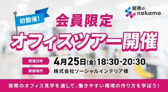 ITの総合商社・株式会社Wiz(本社:東京都豊島区、代表取締役社長:山崎 俊、以下「Wiz」)が運営する、総務コミュニティ「総務のnakama」は、会員様を対象に、株式会社ソーシャルインテリア様のご協力のもと、2025年4月25日(金)にオフィスツアー&交流会を開催します。今回は、実際のオフィスを見学しながら、参加者それぞれのオフィス利用に関する課題や悩みを共有し、解決の糸口を探ることを目的としています。交流会には、アドバイザーとして株式会社月刊総務・代表取締役社長の豊田 健一 氏をお迎えいたします。ぜひお気軽にご参加ください!