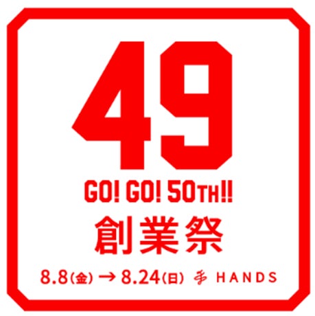 株式会社ハンズ(本社:東京都新宿区)は、2025年8月に創業49周年を迎えます。これまでのご愛顧に感謝すると共に、2026年の創業50周年へ向けてさまざまなキャンペーンやイベントを計画しています。「GO!GO!50TH!!」を合言葉に、お客様がワクワクする多彩な企画を用意しておりますのでどうぞご期待ください。
