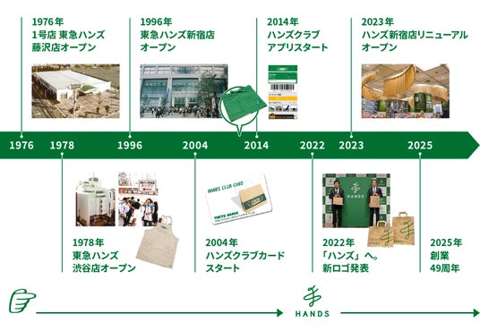 1976年8月に創業した東急ハンズは、1号店「東急ハンズ藤沢店」オープンから始まり、1978年には渋谷店、1996店には新宿店をオープンいたしました。2022年にブランドをリニューアルし、新たな屋号「ハンズ」、漢字の手をモチーフにした新たなロゴを発表。各店のリニューアルオープンや新店開業など、今なお成長を続けるハンズは2026年に創業50周年を迎えます。