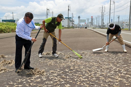 2025年6月25日。セントレアに鬼崎漁協、里山保全の「野村緑の会」、空港会社の3者が集結。ヒトデの受け渡し式が行われました。まず3者は天日干しされたヒトデを共に回収し、細かく取り、袋済めする作業を行いました。