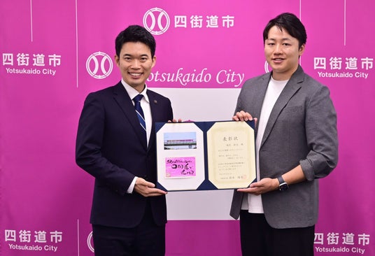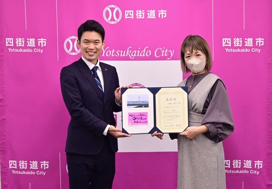 四街道市PR 横断幕キャッチコピー表彰式が、9月2 6日(金)に行われ、キャッチコピー提案者の、滝沢 祐太(たきざわ ゆうた)さん、楠岡 愛子( くすおか あいこ) さんに表彰状を授与しました。