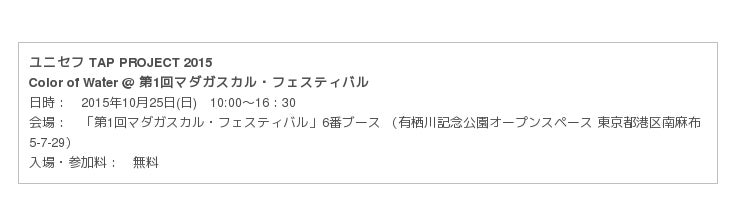 公益財団法人 日本ユニセフ協会(東京都港区・赤松良子会長)は、10月25日(日)に有栖川記念公園(東京都港区)で開催される「第1回マダガスカル・フェスティバル」(主催:在日マダガスカル共和国大使館)で、スマートフォンで写真を投稿すると100円の募金がマダガスカルの子どもに安全な水を届けるユニセフ募金になるイベント『Color of Water』を出展します。