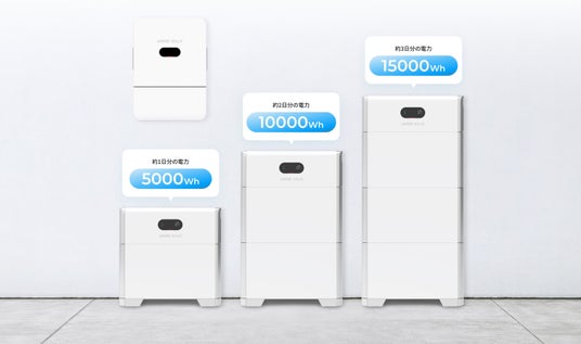 - 選べる3モデル:もしもの停電に備えた最低限の電力を確保できる5000Wh、日常で使用する電力を備えられる10000Wh、オール電化でも十分に対応できる15000Whの3つの容量帯を用意。