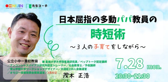 株式会社NIJIN(本社:東京都江東区、代表取締役:星野達郎)が運営する教員向けコーチングサービス「先生コーチ」は、2025年7月28日(月)に、オンラインイベント『日本屈指の多動パパ教員の時短術 ~3人の子育てをしながら~』を開催いたします。