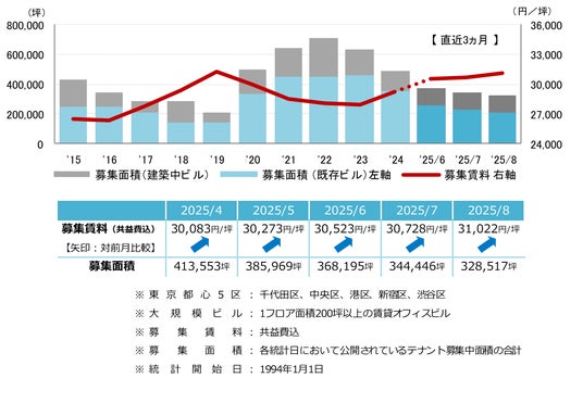 三幸エステート株式会社(本社:東京都中央区、取締役社長:福島正二郎)は、2025年8月度の東京都心5区(千代田区、中央区、港区、新宿区、渋谷区)および全国6大都市(東京、札幌、仙台、名古屋、大阪、福岡)の大規模ビル※1のマーケットデータをまとめた「オフィスマーケット2025年9月号」を公表します。