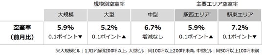 空室率は前月比プラス0.02ポイントの6.16%となり、前月からほぼ横ばいだった。周辺エリアのビルや売買により貸止めとなっていたビルで空室が生じたものの、拡張移転や館内増床で空室床の消化が進み、わずかな動きに止まっている。潜在空室率は前月比プラス0.01ポイントの7.37%だった。
